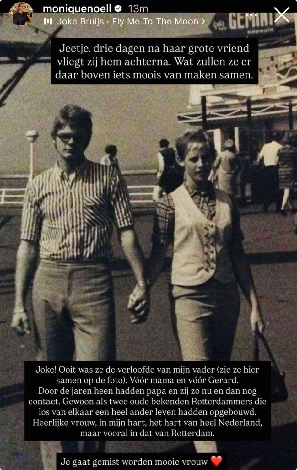 Monique beschrijft hun band als twee mensen die los van elkaar een heel ander leven hadden opgebouwd, maar toch die warme verbinding behielden. Ze omschrijft Joke als een heerlijke vrouw die niet alleen in haar hart leeft, maar ook in het hart van heel Nederland en vooral in dat van Rotterdam. Het is prachtig om te zien hoe oude genegenheid kan blijven bestaan, zelfs wanneer het leven andere wegen inslaat en nieuwe liefdes worden gevonden.