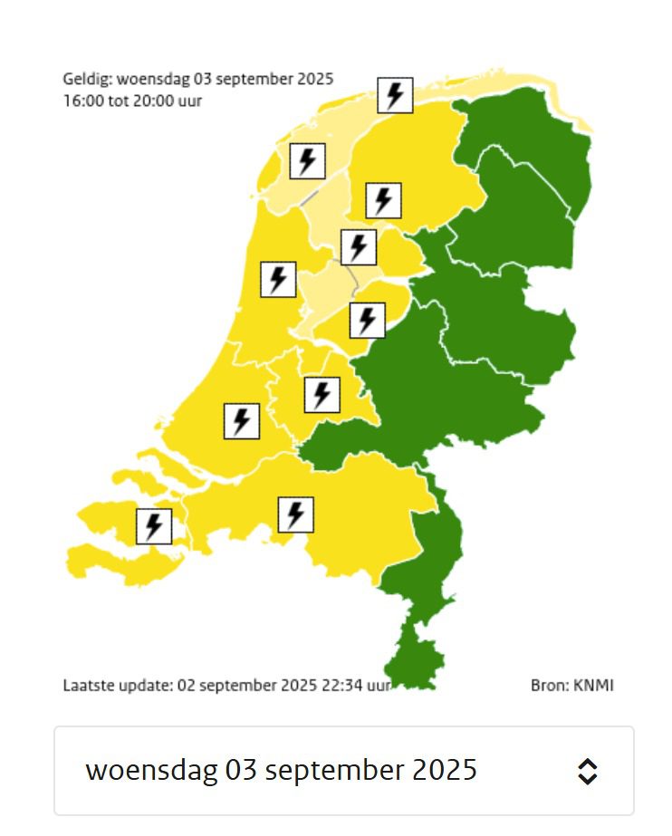 KNMI heeft Code Geel afgegeven als waarschuwing voor delen van Nederland op woensdag 3 september. Verwacht wordt flink wat regen, maar ook hevige onweersbuien. Woensdag ochtend begint eerst bewolkt en regenachtig, maar in de tweede helft van de middag bereiken stevige regen- en onweersbuien het land.