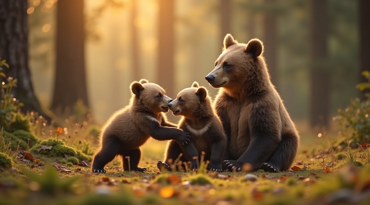 Terwijl de moederbeer rustig toekeek, toonden haar drie kleintjes een speels gedrag dat zelfs ervaren natuurfotografen zelden meemaken. De welpen vormden spontaan een perfecte kring en begonnen als echte kinderen met elkaar te spelen, duwend en stotend met hun kleine pootjes. “Ze stonden daar ongeveer een halve minuut, duwend en stotend,” beschrijft Mulkahainen het ontroerende tafereel. Het speelse gedrag escaleerde tot hilarische stoeipartijen waarbij alle drie de welpen uiteindelijk in één grote hoop op de bosgrond belandden.