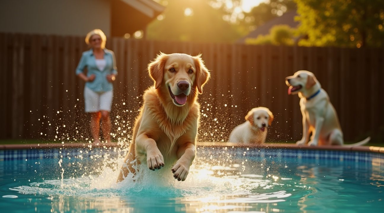 Golden Retriever glipt stiekem het zwembad van de buren in