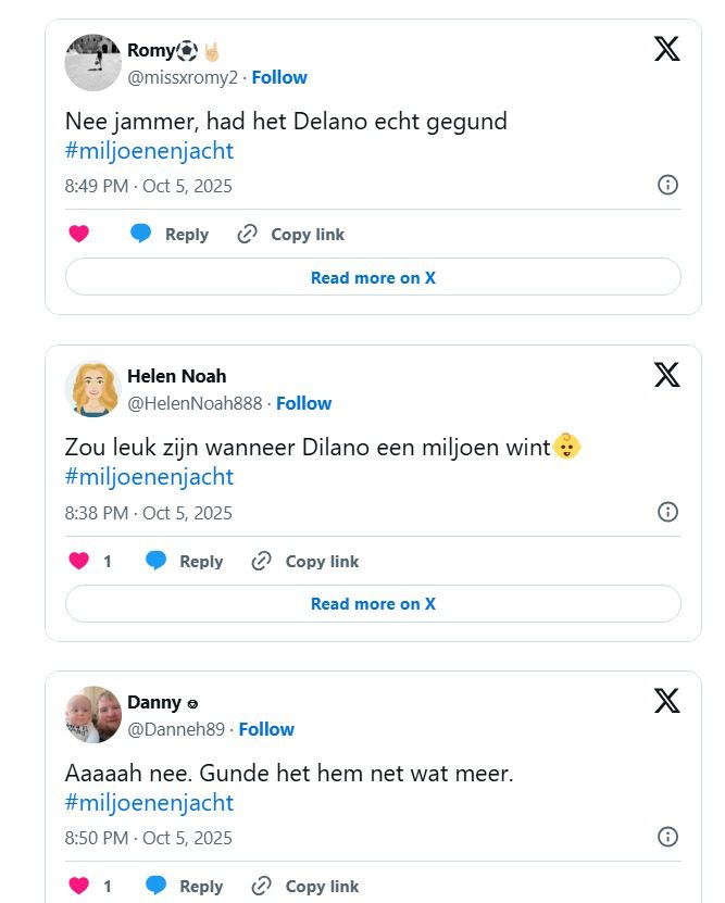De golf van sympathie voor Delano stroomde direct over naar sociale media, waar duizenden kijkers hun teleurstelling uitten over zijn uitschakeling. Op X verschenen massaal berichten vol steun en medelijden voor de jonge kandidaat. “Ah nee. Gunde het hem net wat meer”, schreef een kijker die duidelijk meegeleefd had met Delano’s spannende reis. De emotionele betrokkenheid was zo groot dat vele mensen al voorspelden dat hij zou winnen nog voordat de beslissende vraag gesteld werd.