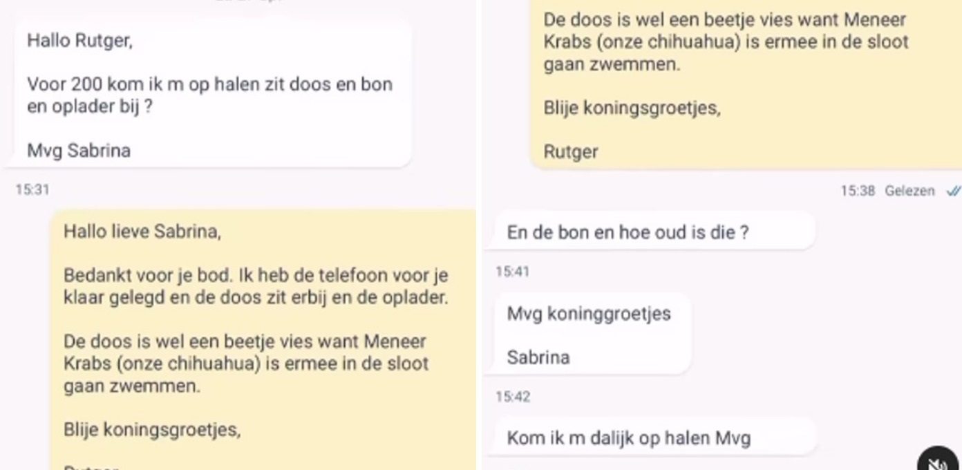 Je denkt misschien dat je alles wel eens hebt meegemaakt op Marktplaats, maar dit gesprek tussen Sabrina en Rutger over een telefoonverkoop slaat werkelijk alles. Wat begint als een normale onderhandeling over een tweedehands toestel eindigt in een absurd verhaal over skelters door de McDrive, koninklijke feestjes en een chihuahua genaamd Meneer Krabs die de sloot induikt met de telefoonverpakking.