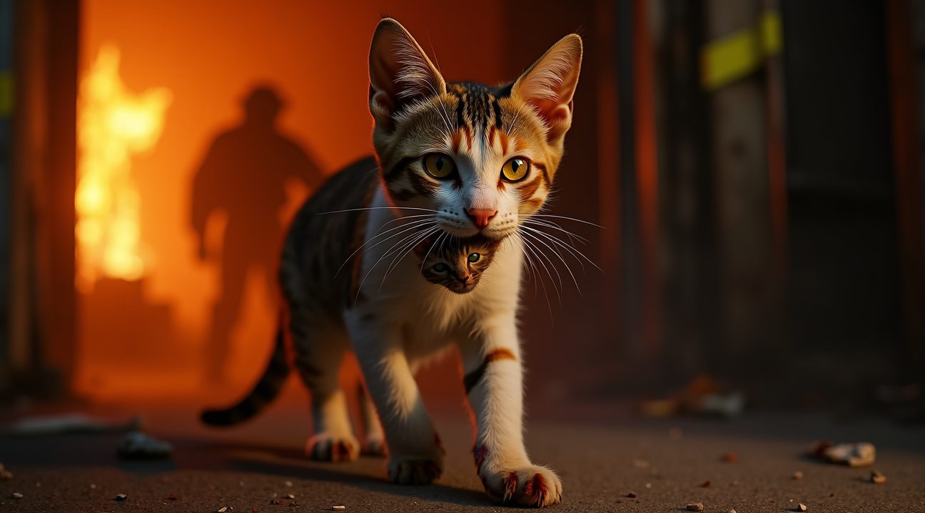 Elke keer dat Scarlett het brandende gebouw binnenging, werden haar verwondingen erger. Haar vacht verschroeide, haar pootjes brandden, maar ze gaf niet op. Vier keer rende ze door de vlammen, en elke keer bracht ze een kitten naar de veilige plek waar ze haar eerste baby had achtergelaten.