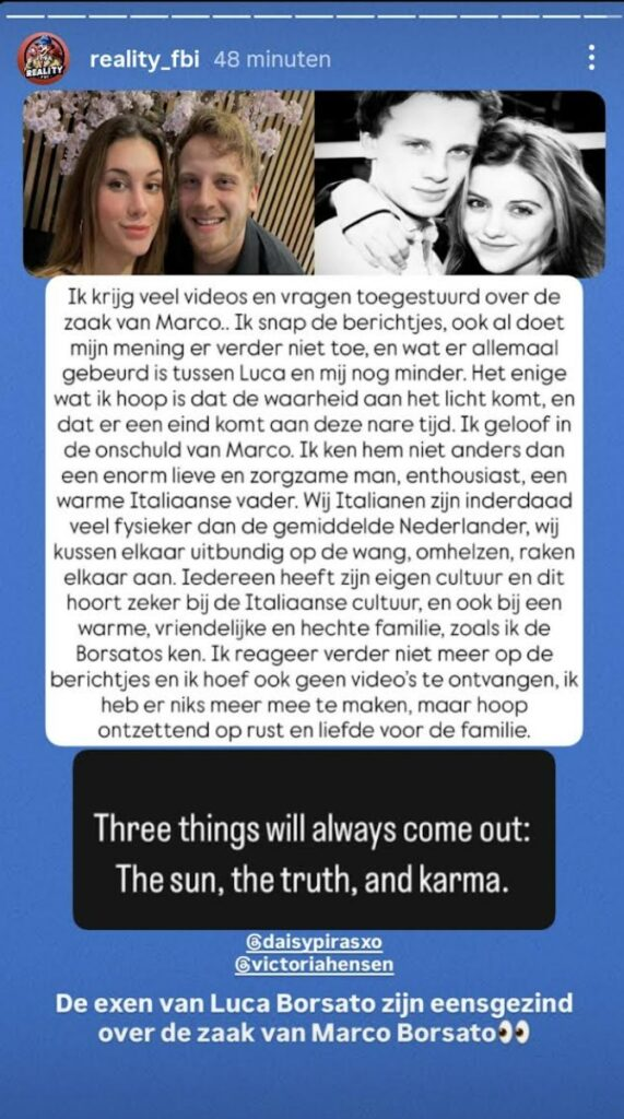 De jonge vrouw benadrukt dat Italiaanse mannen van nature veel expressiever en fysieker zijn in hun omgang dan wat in Nederland gebruikelijk is. Ze roept op tot begrip en rust voor de familie Borsato, die volgens haar al genoeg heeft geleden onder alle commotie. Haar steunbetuiging komt op een moment dat meerdere mensen uit Marco’s omgeving publiekelijk hun geloof in zijn onschuld uitspreken.