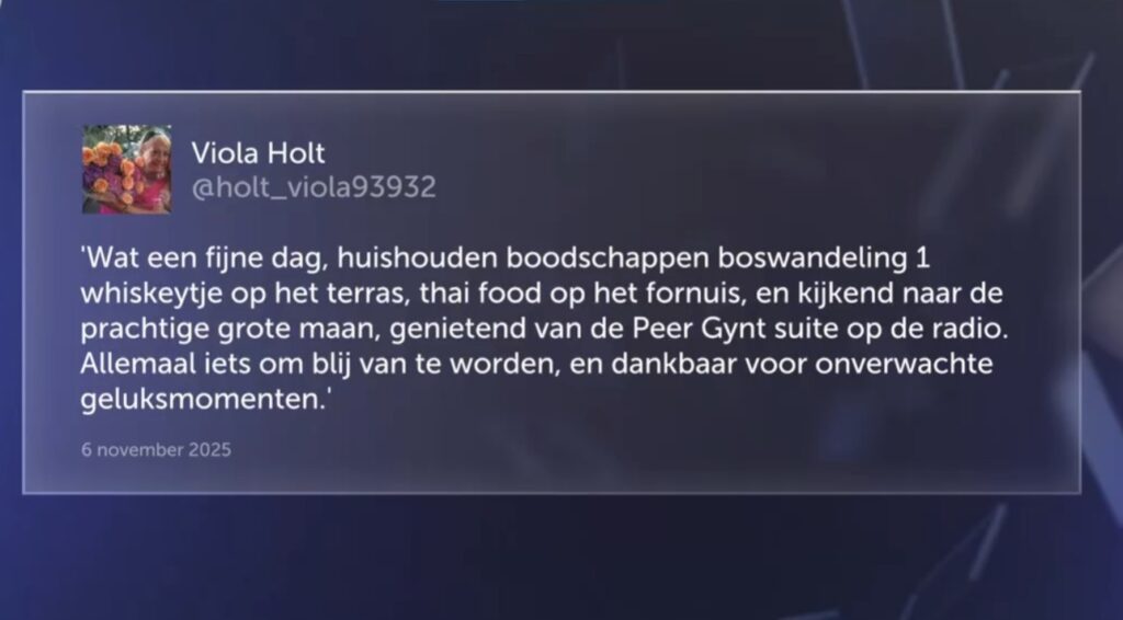 Het laatste bericht dat Viola Holt enkele uren voor haar overlijden op X plaatste, toont een vrouw die ten volle genoot van de eenvoudige geneugten des levens. “Wat een fijne dag, huishouden, boodschappen, boswandeling, 1 whiskeytje op het terras, thai food op het fornuis, en kijkend naar de prachtige grote maan, genietend van de Peer Gynt suite op de radio”, schreef de presentatrice vol dankbaarheid. Haar woorden ademden pure vreugde uit over gewone, alledaagse momenten die zij als kostbare geschenken beschouwde.